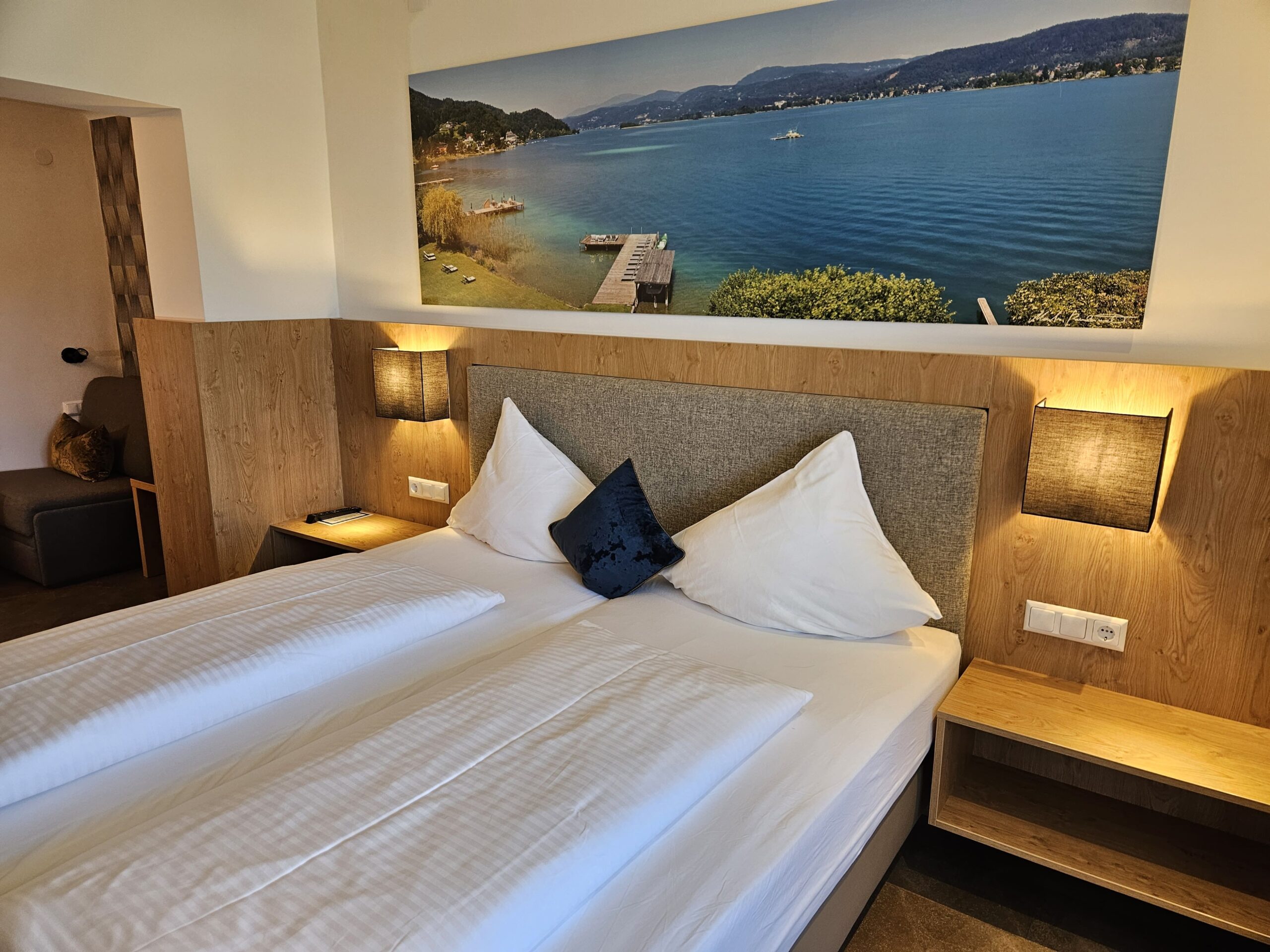 Ein Doppelzimmer für 2 bis 3 Personen bzw. für 2 bis 4 Personen (1 Doppelbett + 1 oder 2 Couchbetten) mit ca. 21 – 24 m² Wohnfläche und Balkon Richtung Norden mit Poolblick, Fön, Dusche/WC, Minibar, Direktwahltelefon, Flat-TV, Zimmersafe, Badetasche mit Bademantel und Badetuch.